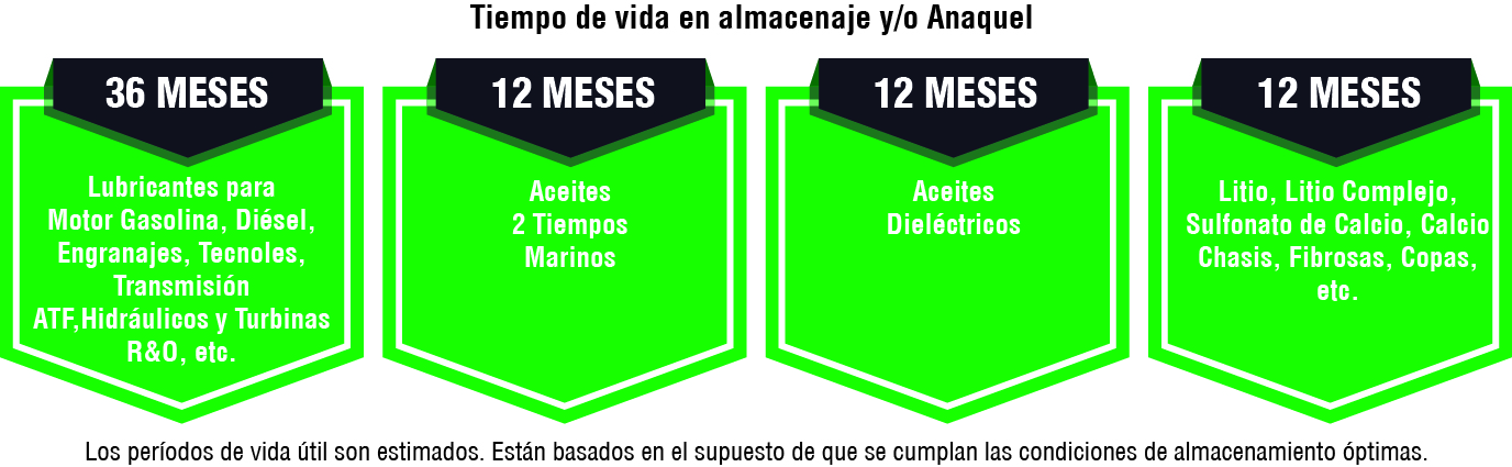 Es importante aclarar que las propiedades fisicoquímicas del Lubricante no caducan, se establecen periodos estimados de vida útil en almacenaje por cuestiones de mercado y de pequeñas variaciones que pudieran ocurrir en sus características, en el caso de que el producto supere el tiempo de vida de anaquel este deberá ser analizado y los resultados compararse con los valores reportados del producto original. Para este fin se debe efectuar un muestreo aleatorio del lote de producto siguiendo buenas prácticas de muestreo: Muestra homogénea y representativa, limpieza, evitar contaminación y uso de recipientes nuevos y adecuados para el muestreo. Si los resultados del análisis están dentro de las características originales, indicará que es adecuado para su uso.